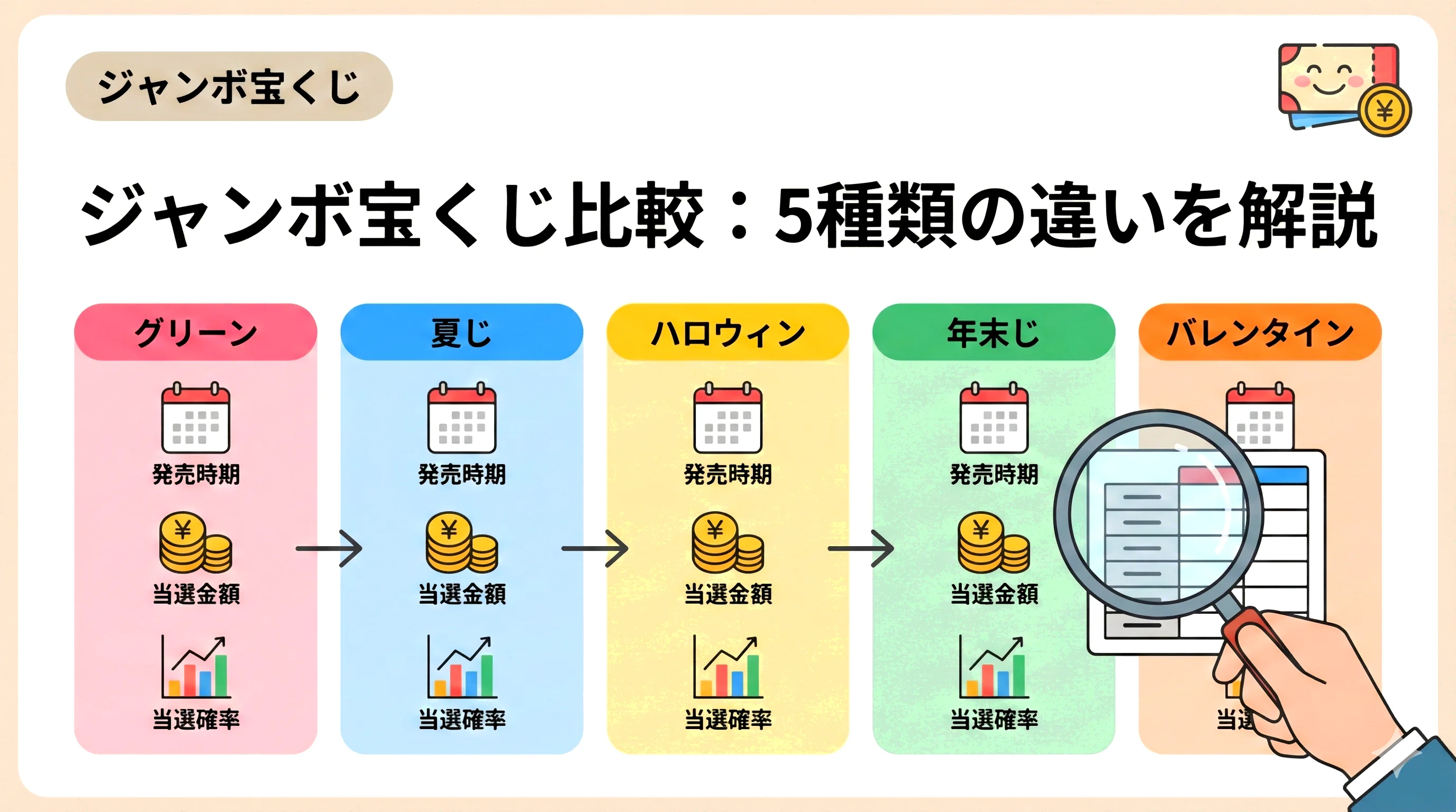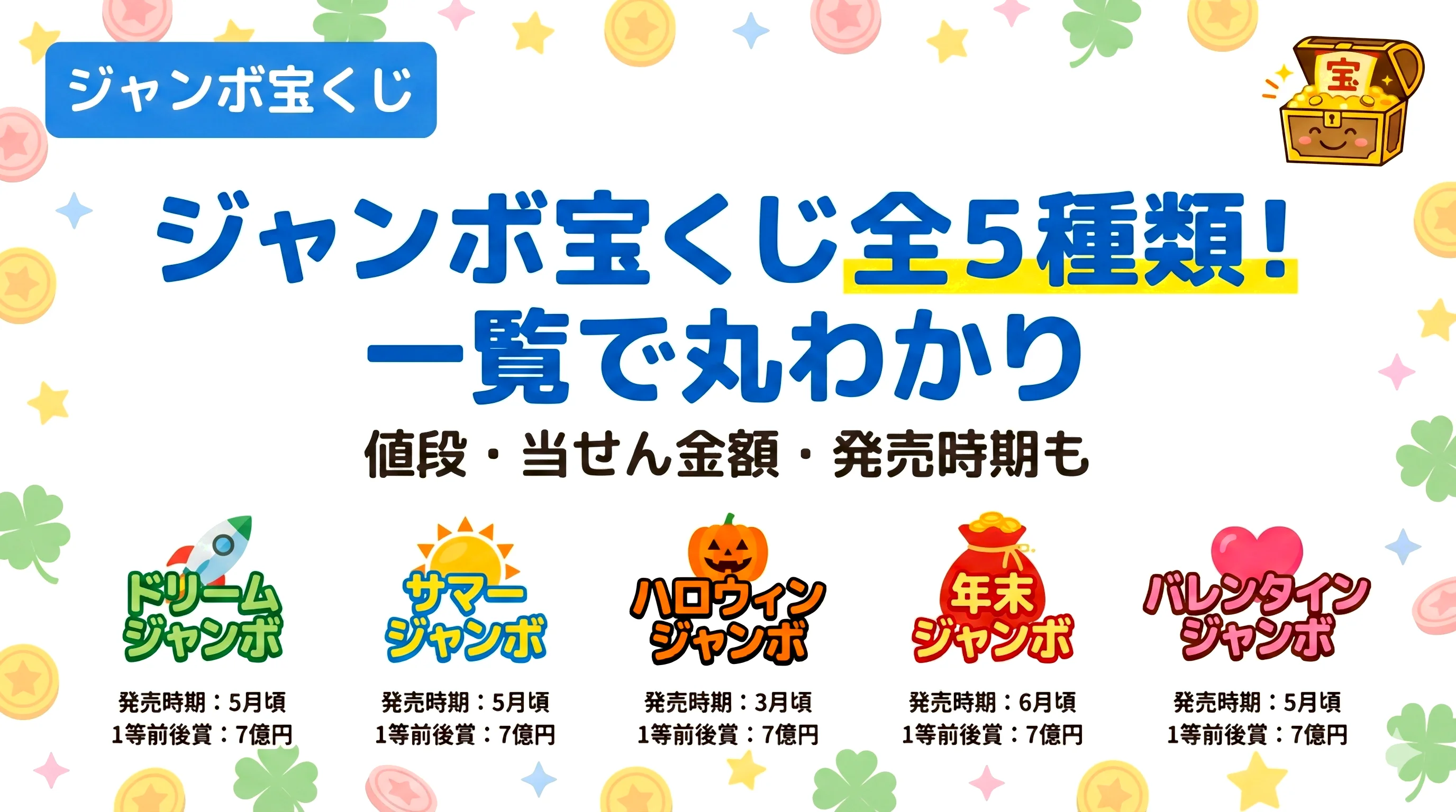 ジャンボ宝くじ全5種類の一覧|発売時期・当選金額・当選確率の違いを比較解説